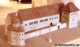 Modell des mittelalterlichen Palas der Alten Hofhaltung. Links die 1050 geweihte Andreaskapelle, von der heute noch zwei Innenwände an der Südwand der Alten Hofhaltung erhalten sind. Das turmartige Gebäude rechts, die "Hohe Warte", entstand durch Umbau der Thomas- und Katharinenkapelle. - Im Vordergrund die Tattermannsäule, der "Nabel" des Reiches, von dem aus die Straßen gemessen wurden. |